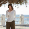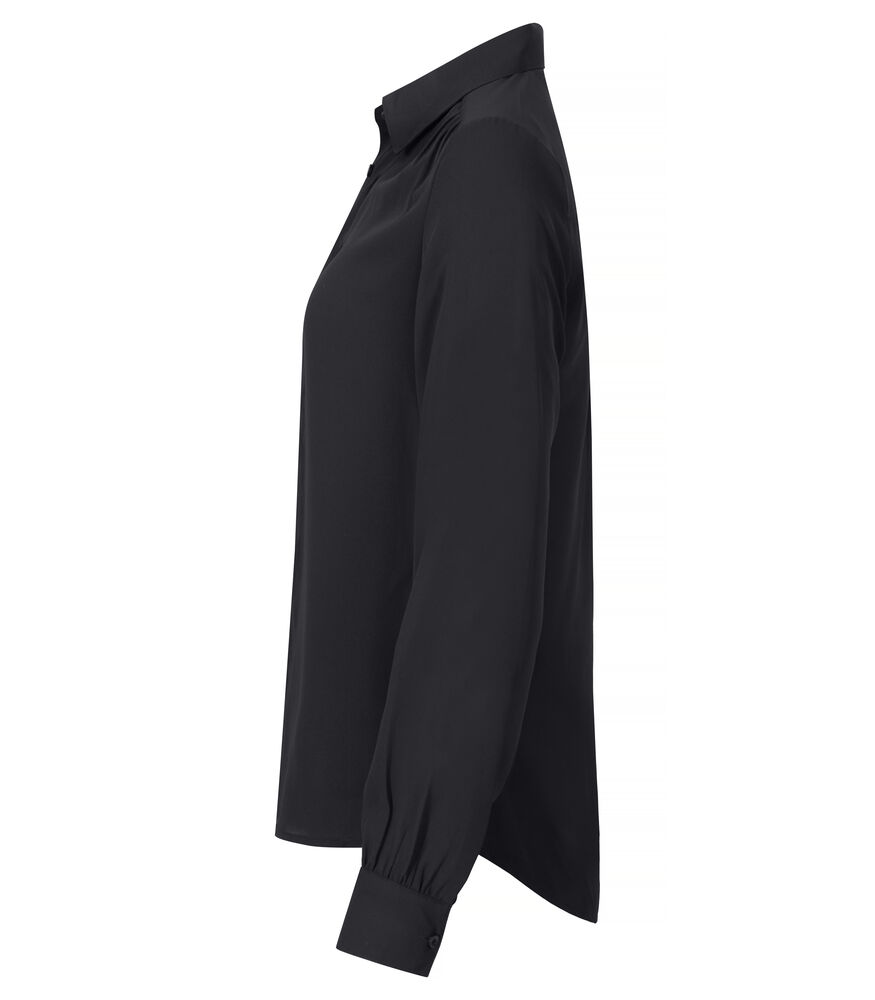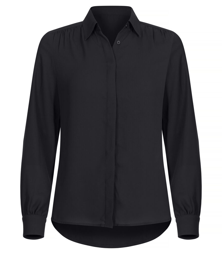 En tidløs klassisk bluse. Laget i et lett og semi-gjennomsiktig materiale med fin flyt. Skjult knappestolpe. Rynket i front og i ermavslutning. Bærestykke bak.