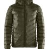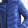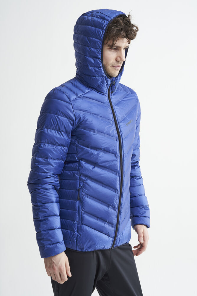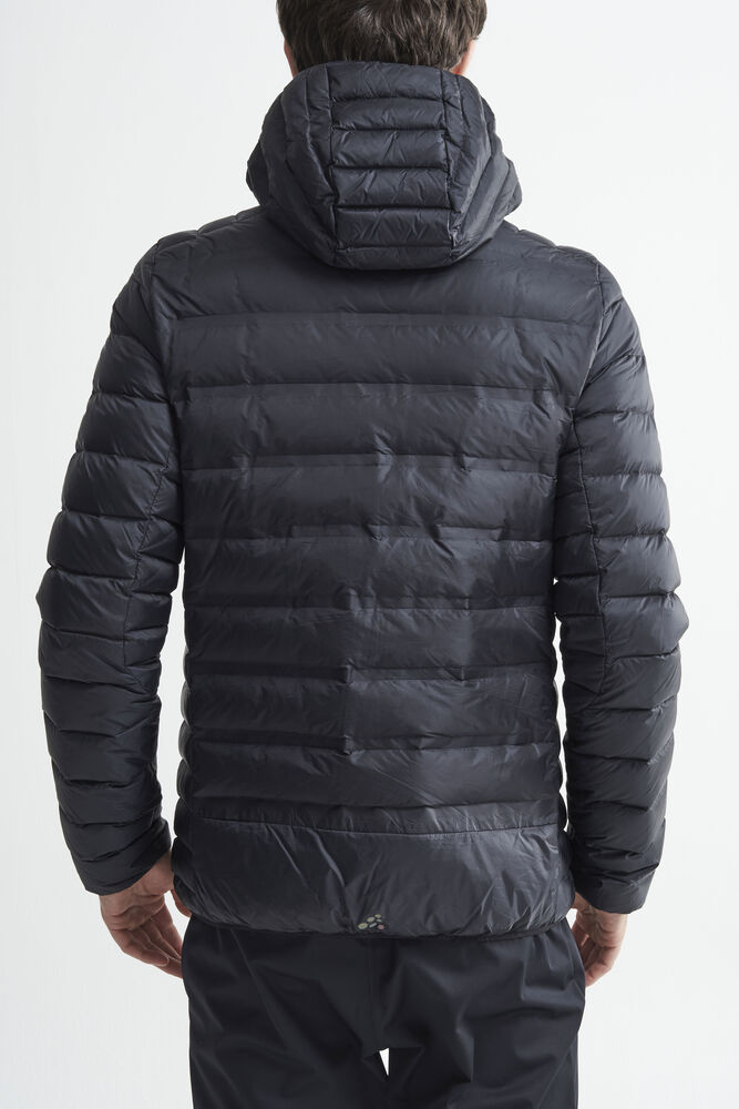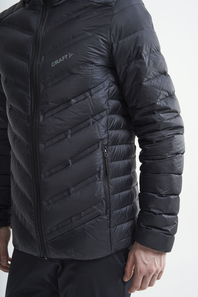Lett dunjakke med limte kanaler, formet hette og to sidelommer med glidelås.