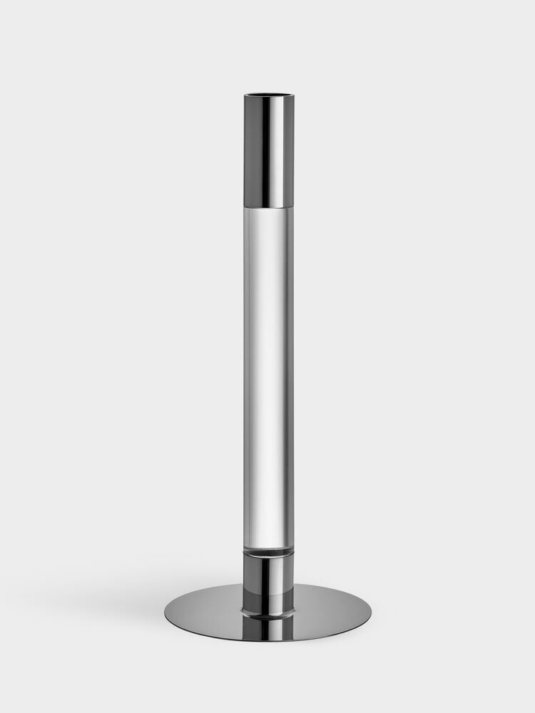 Ingegerd Råman har med sitt tilbakeholdne designspråk gitt Lumiere-lysestaken et moderne og minimalistisk uttrykk. Den sylindriske glasstaven er kombinert med en stor fot og lysholder i sølvblankt metall.