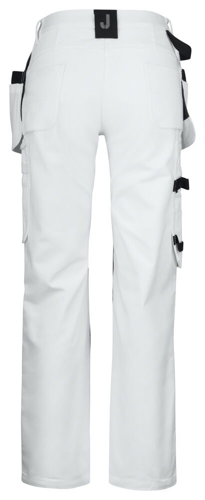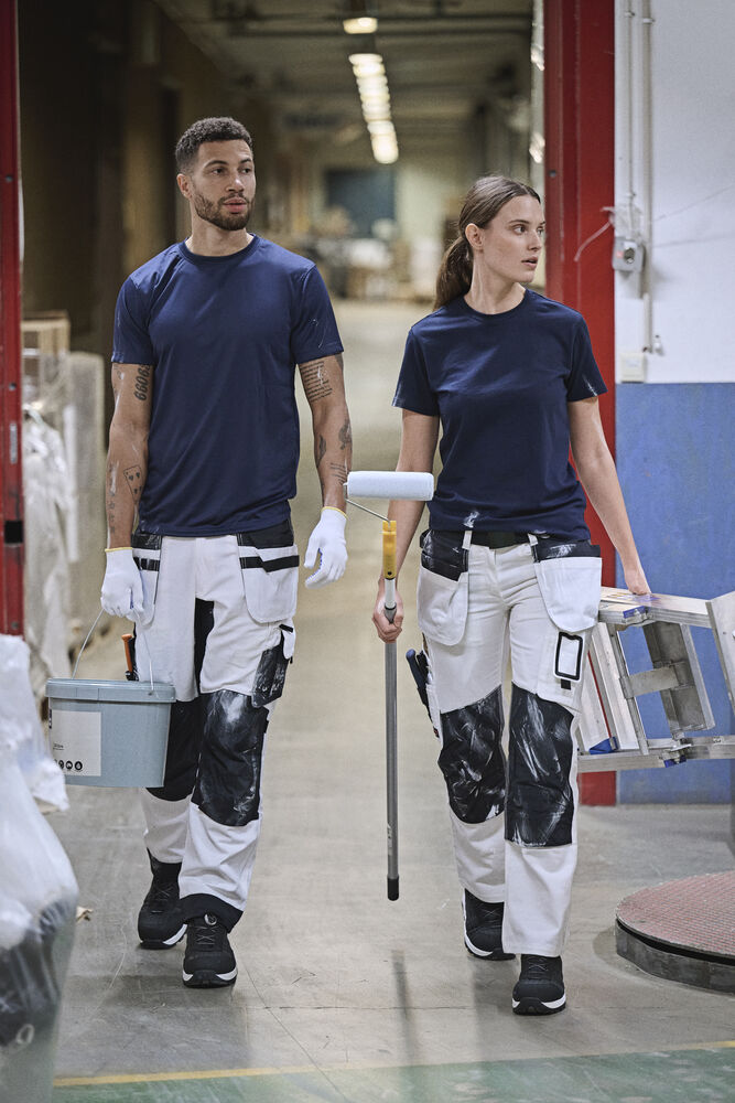 Malerbukse med svært god passform og design utviklet for profesjonelle malere. Jobmans bomullstwill har gode egenskaper, den er slitesterk, absorberer maling og minimerer gjennomblødning. Malerbuksen har romslige hengelommer. Den indre lommen har vannavstøtende FA™-polyamidfôr på innsiden. Romslige front- og baklommer, benlomme med ekstra rom og glidelås, mobiltelefonlomme og ID-kortholder. Kniv- og tommestokklomme med praktiske rom for alle tenkelige maleverktøy. Buksen har også en løkke for kluter. Tåler vask på 85 grader. Knebeskyttelseslommer i slitesterkt FA™-polyamid med to posisjoner for knebeskyttelse.
