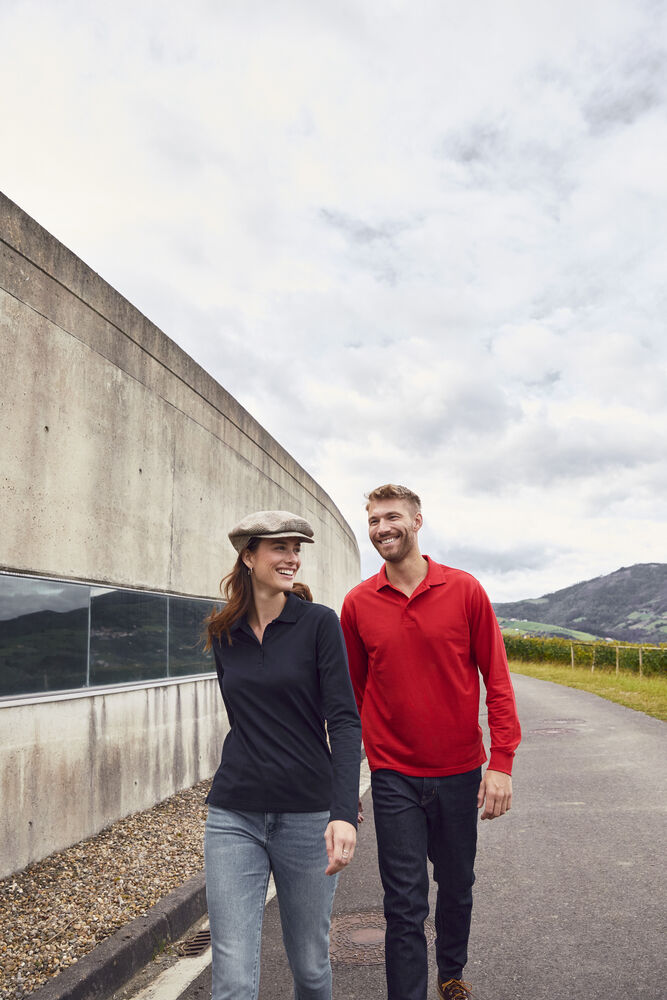 En langermet versjon av vår bestselgende polo. Herremodellen har mansjetter i ribb. Begge versjonene har to jacquardstrikkede striper på kragen, tre ton-i-ton-knapper i stolpen, samt en lett avtagbar etikett for rebranding. Manhatten L/S er forhåndskrympet og enzymbehandlet.