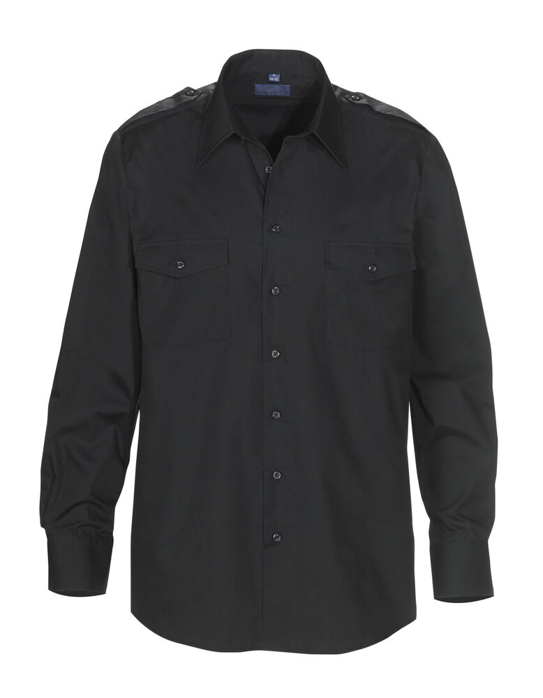 Langermet pilotskjorte med skulderklaffer. Doble brystlommer med klaff, penn- og merkeholder. Ton-i-ton-knapper, turn down-krage. Blandet materiale.
