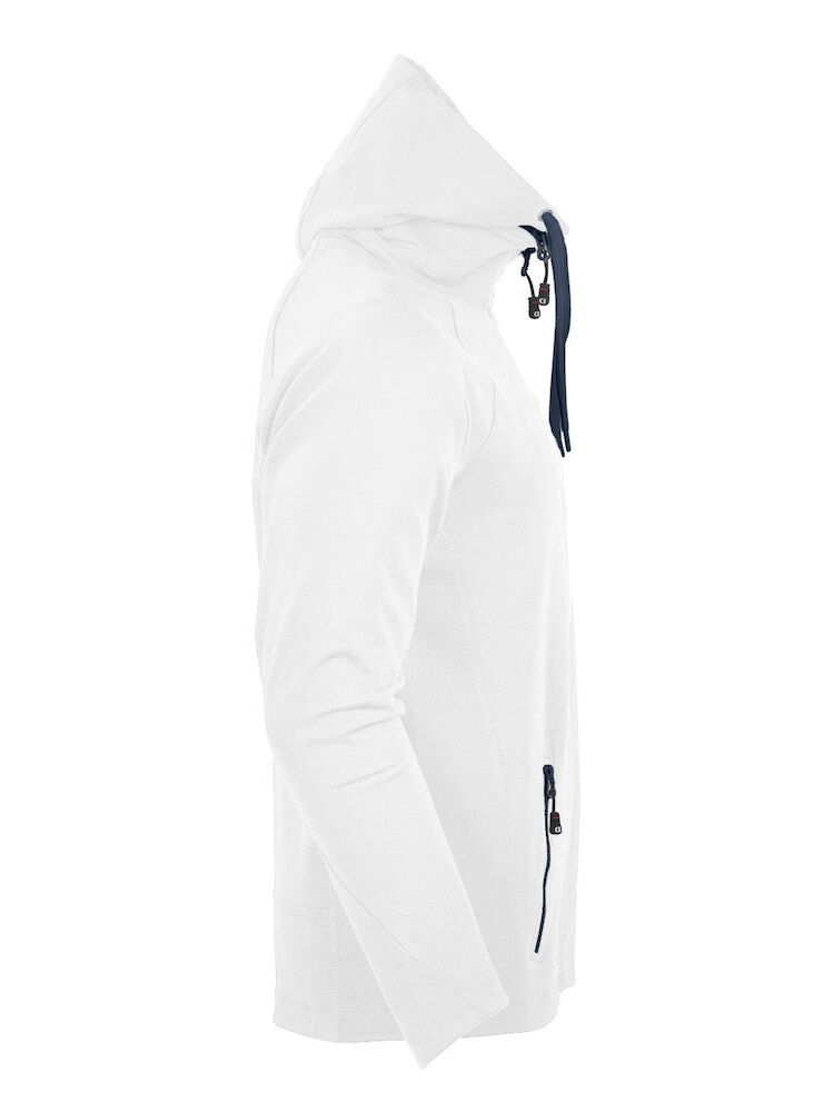 Myk og smidig hettejakke i maritim stil, laget i blandingsmateriale for god komfort. Unik løsning med avtakbar hette der glidelåsen både fyller en praktisk og en dekorativ funksjon. Kraftige glidelåser i avvikende farge. To sidelommer samt dekorsømmer