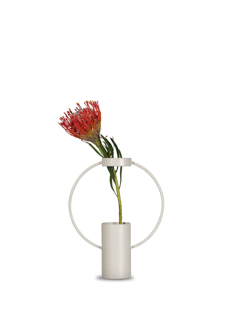 Elegant, moderne og stilig vase i pulverlakkert metall. Designet av Pascal Charmolu. Vasen fungerer like bra som en innredningsdetalj som en praktisk vase hvor den øverste delen holder blomsten på plass. Vasen er kommer i to ulike farger og størrelser.