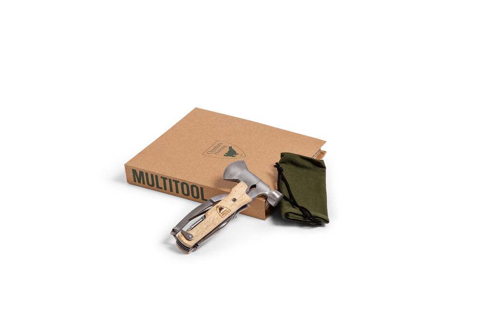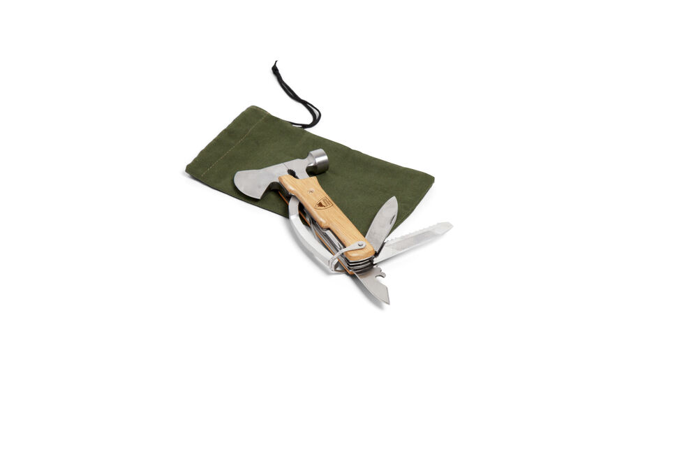 Multiverktøy med tang, avbiter, liten øks, kniver, neglfil, meisel og flaskeåpner. Leveres i en fin canvaspose og gaveeske.