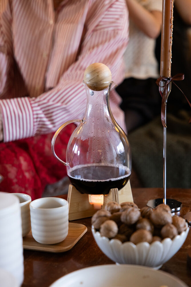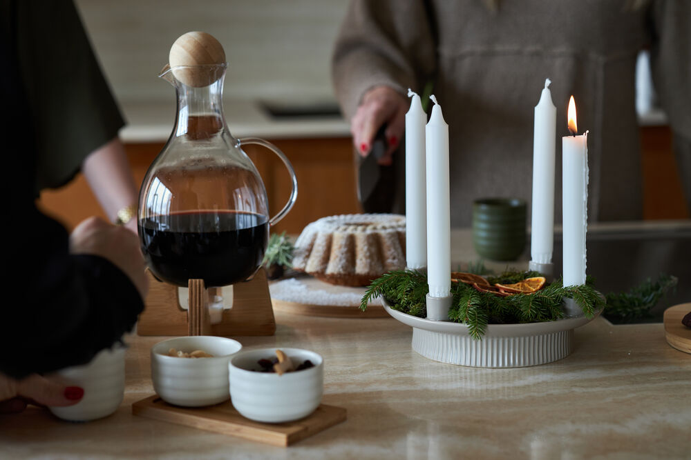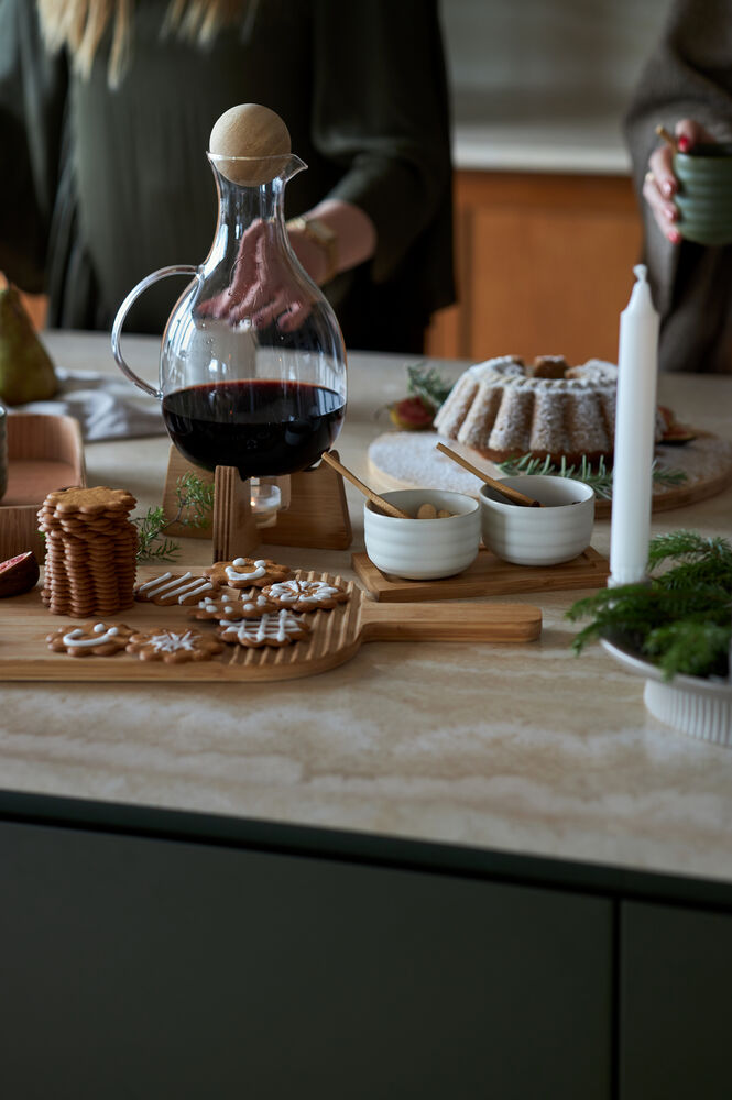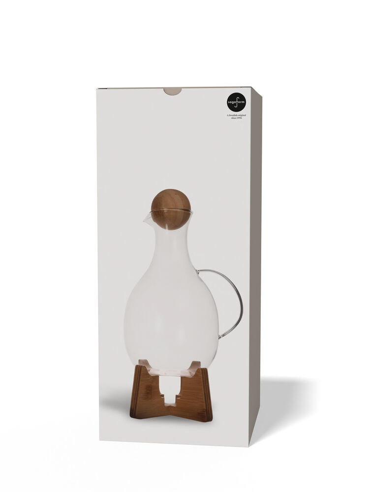 Gløggkannen har en lang historie som vi har forvaltet og foredlet til en moderne versjon. Vi har utvidet bruken og ønsker den velkommen som serveringsmugge til kaffen når julen er over. Her møter glass bambus, og runde former dominerer. Kannen har en rund kork og utstråler enkelhet og stilig design hele veien. Varmes opp av et telys på bambusstativ.