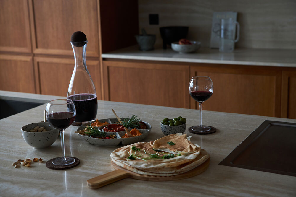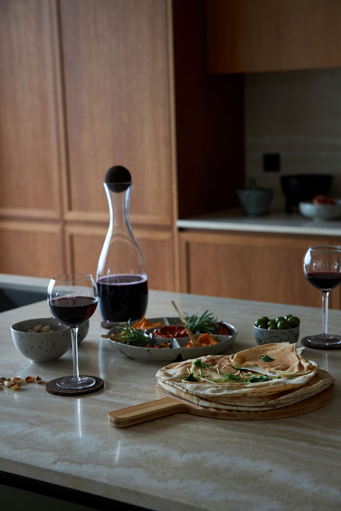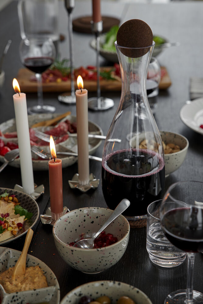 Nature vinkaraffel med korklokk kombinerer holdbarhet, bølgende former og mystikk. Den mørkebrune kork-kulen gir karakter, og leder tankene til havets flaskeposter som har vandret langs havbunnen med små vakre budskap. I dag signaliserer den brune fargen luksus og korkens holdbarhet. Nature vinkaraffel harmonerer nydelig med Saga-serien. Karaffelen er tilgjengelig i to størrelser og former.