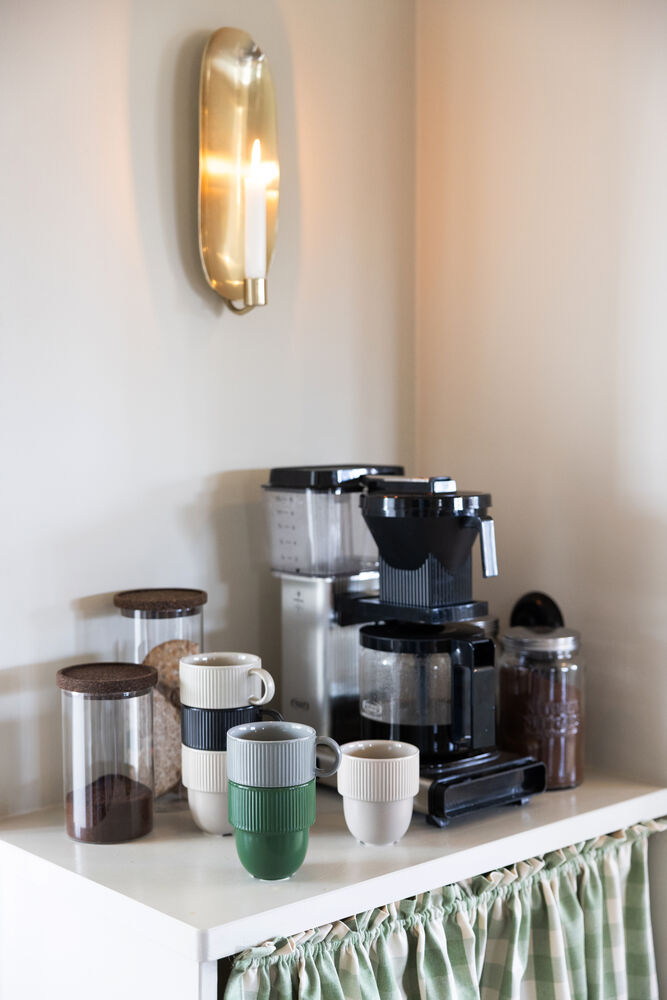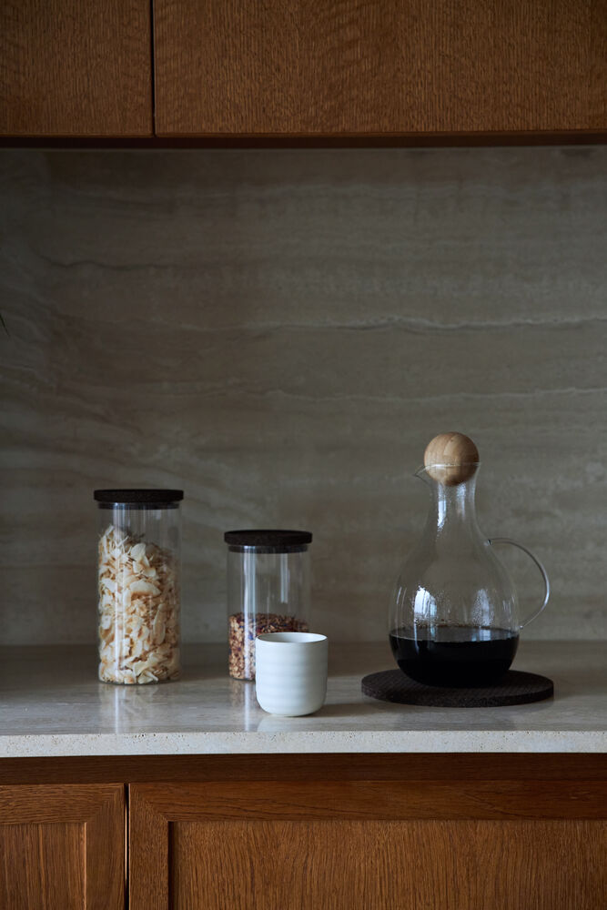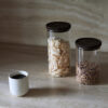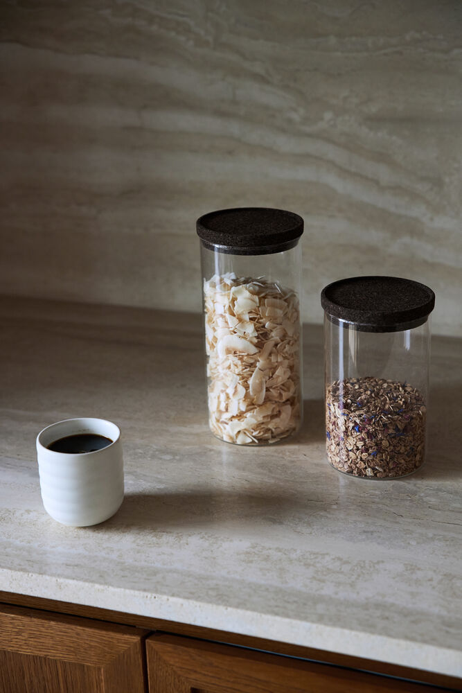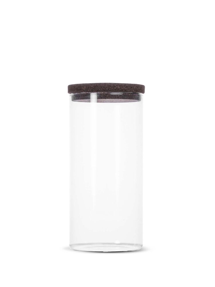 Glasskrukke med mørkebrunt korklokk. En nydelig og klassisk kombinasjon som aldri går av moten. Disse krukkene oppbevarer tørrvarer som müsli, mel eller pasta på en ryddig og vakker måte. De egner seg også til barneleker eller til bomullspad på badet. Krukkene egner seg utmerket til stabling. Tilgjengelig i to størrelser.