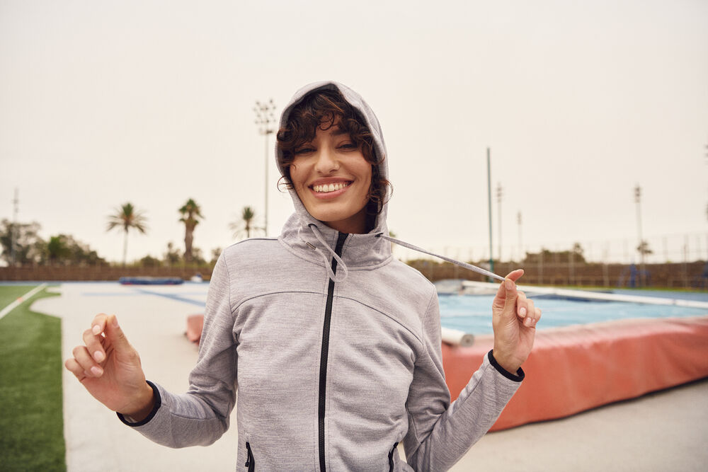 Fin hettejakke i en myk, elastisk og komfortabel polyester. Hette med mesh og snor, frontlommer med zip og innerlommer. Praktiske løsninger til smarttelefon.