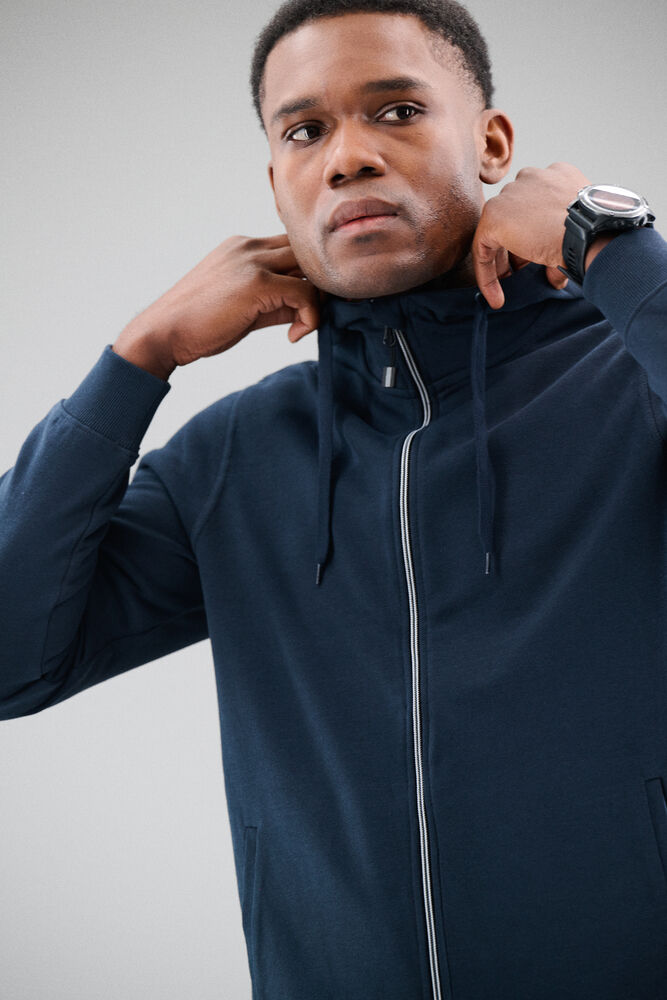 Hettejakke til herre med kontrastfarget glidelås i front. Overhead har stikklommer, hette fôret med singel jersey, samt snor i hetten.