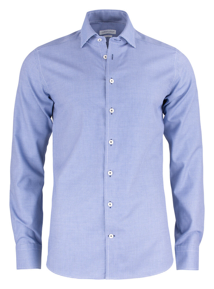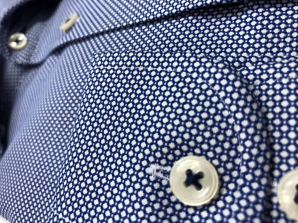 Purple Bow 48 er en blå/hvitprikket skjorte med dobbelt jacquardstoff og et pent, moderne mikromønster. Skjorten passer svært godt i kombinasjon med en ensfarget dress, men er også et godt valg til jeans i hverdagen.