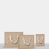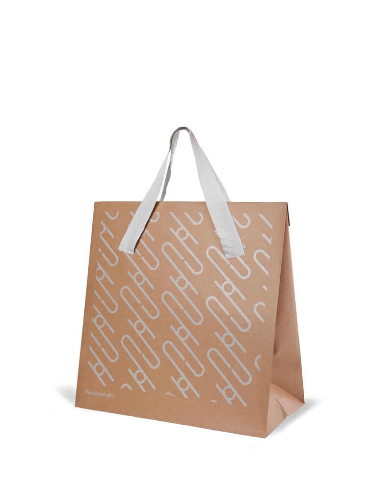 Perfect Gift pose med konvoluttlukking. Posen er laget av brunt FSC kraftpapir, har hvite håndtak og er dekorert med vårt Perfect Gift-mønster. Tilgjengelig i tre størrelser.