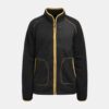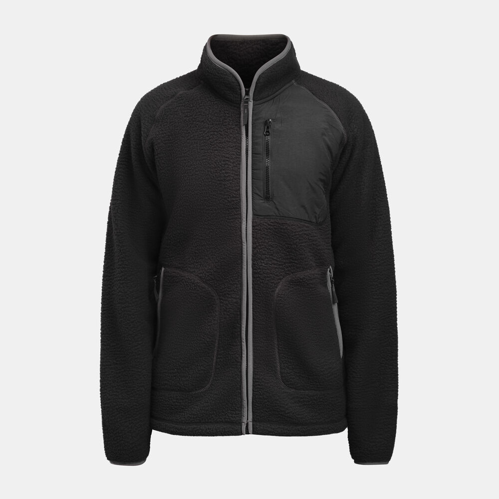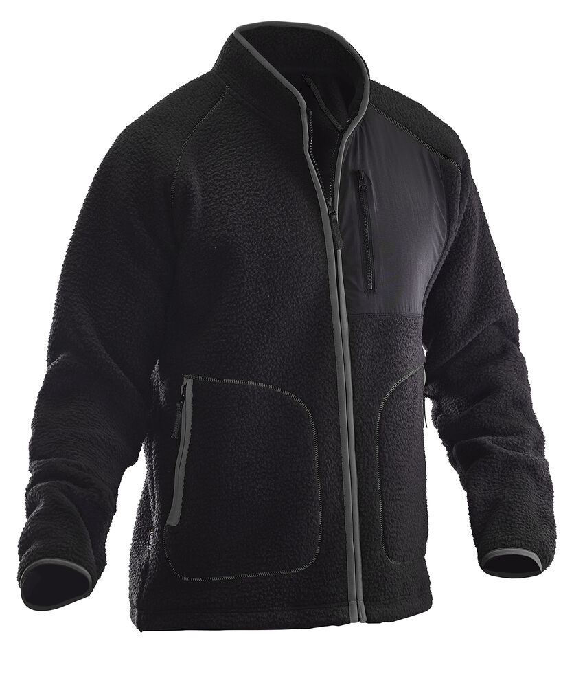 Pelsfiberjakke med partier av tøy ved albuene og brystlommen. Frontlommer med glidelås. Brystlommen er en fin plass for transfertrykk. Elastisk kantband i kontrastfarge i fronten, rundt kragen og ved mansjetten. Justerbar med snor nederst.