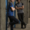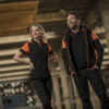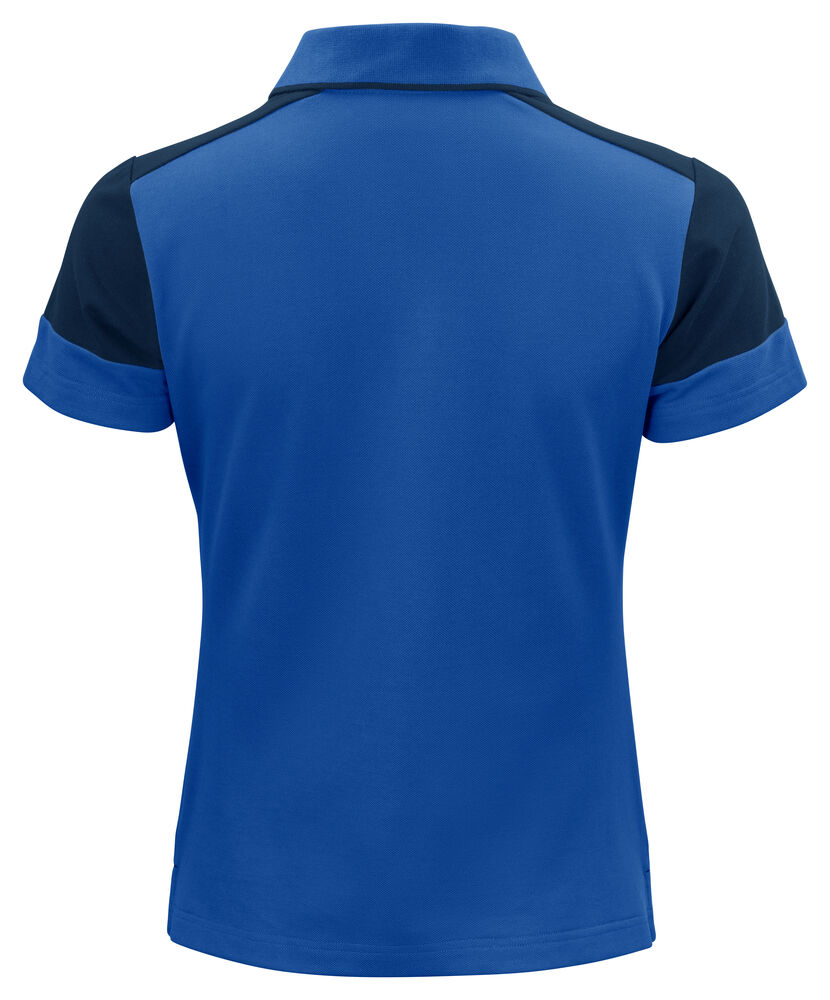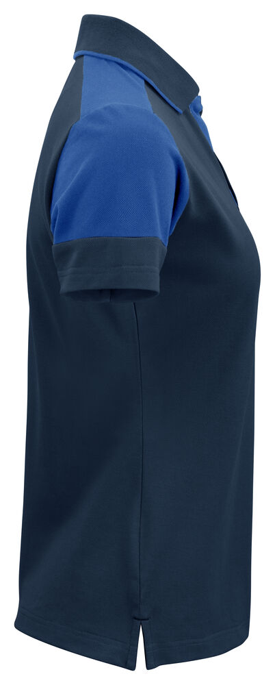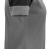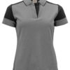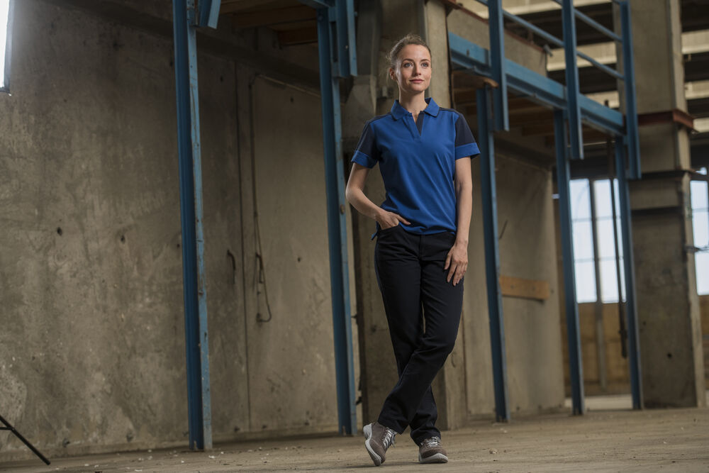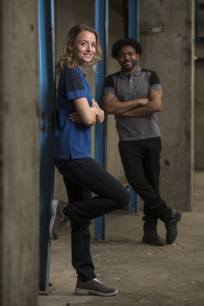 Tofarget pique uten knapper. Krage med kontrastfarge. Kontrastbånd i nakken og på sidespaltene. Tear-out label i nakken og en separat vevd størrelses-label. I den indre venstre sidesømmen er det satt inn en lomme med plass til en vaskechip. Testet for industriell vask i henhold til ISO 15797.