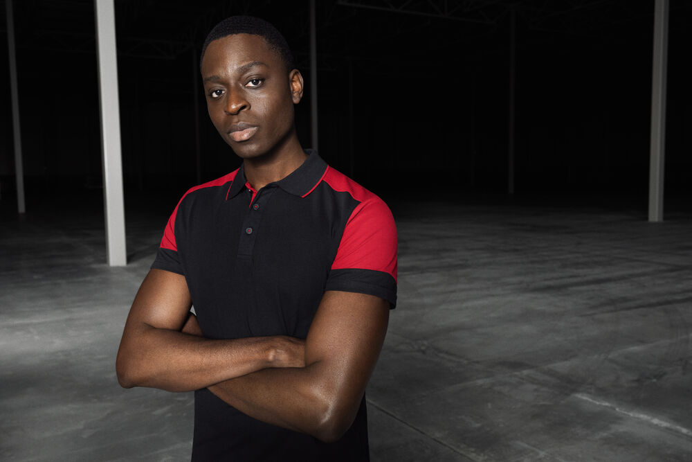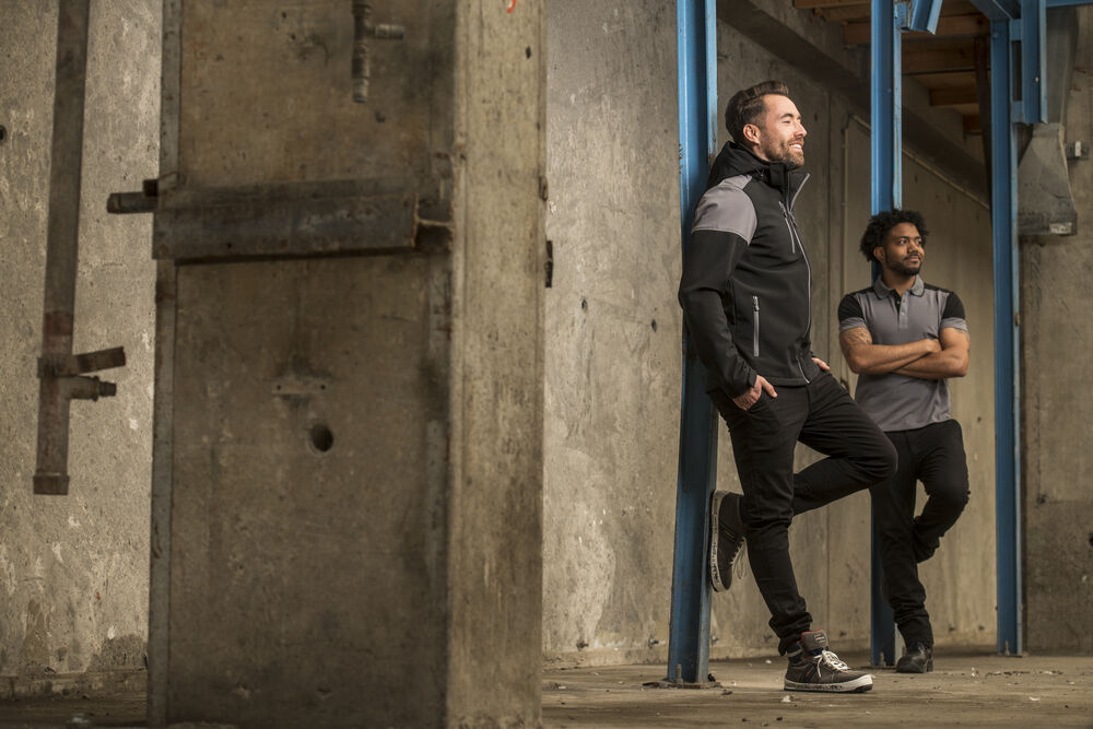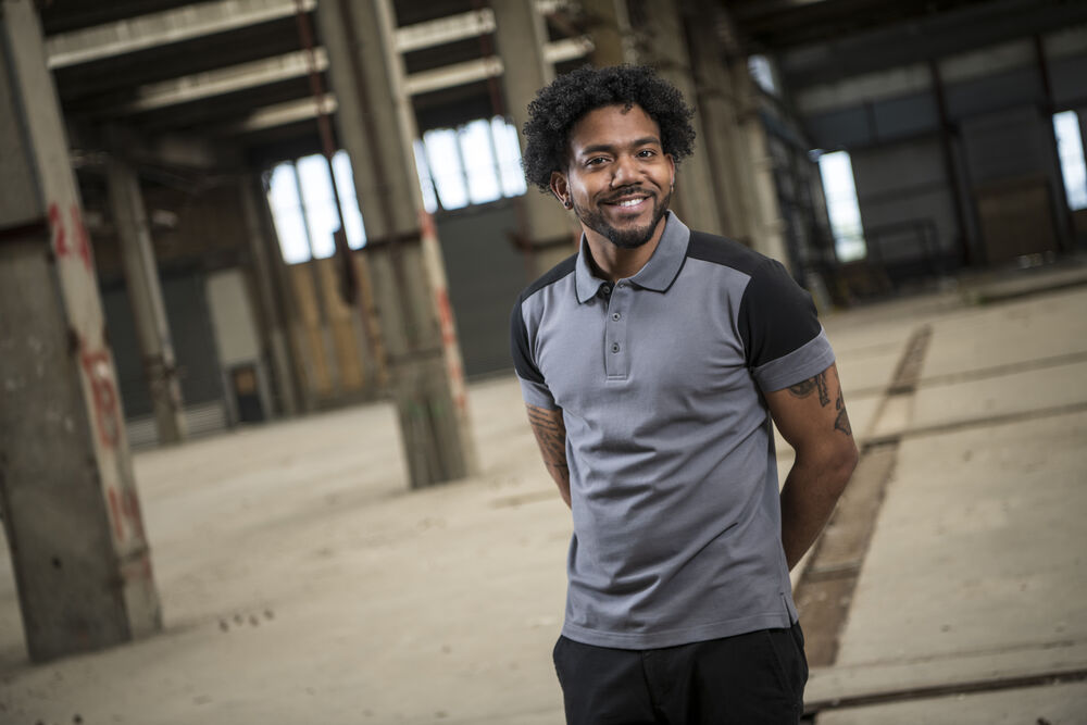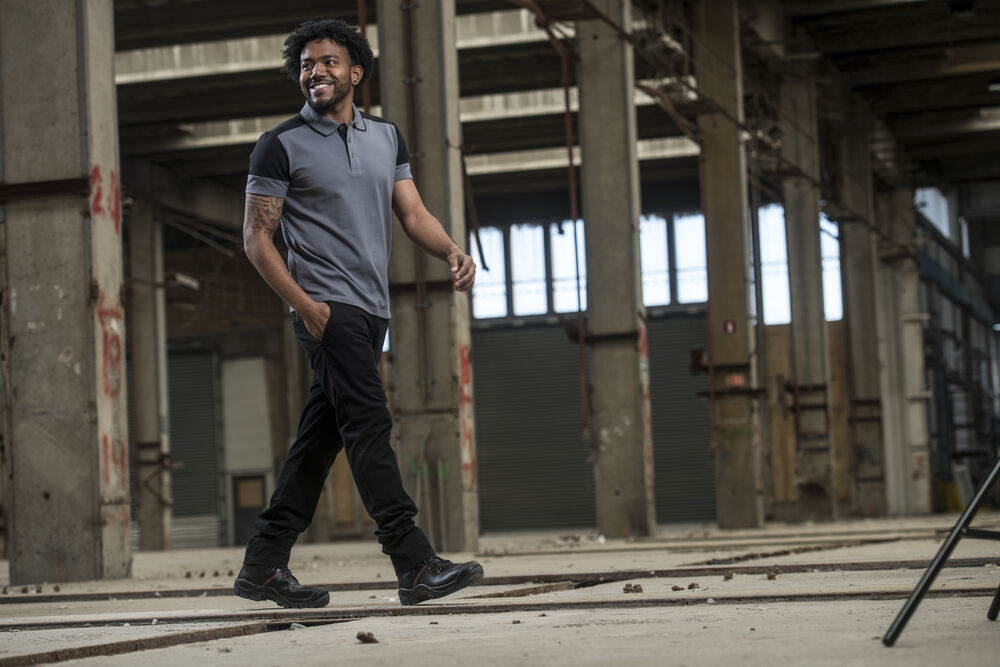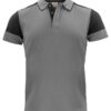 Tofarget pique med tre knapper og krage med kontrastfarge. Kontrastbånd i nakken og på sidespaltene. Tear-out label i nakken og en separat vevd størrelses-label. I den indre venstre sidesømmen er det satt inn en lomme med plass til en vaskechip. Testet for industriell vask i henhold til ISO 15797.