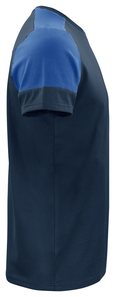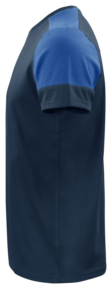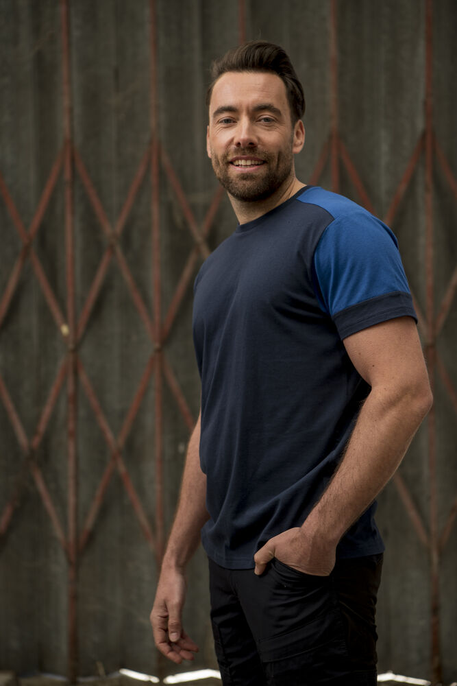 Tofarget t-skjorte med moderne passform. Elastan i nakkeribb. Halsribb med fire lag som gir god stabilitet. Tear-out label i nakken og en separat vevd størrelses-label. I den indre venstre sidesømmen er det satt inn en lomme med plass til en vaskechip. Stoffet har blitt ringespunnet og behandlet med en enzymvask som forkrymper materialet og gir det en myk følelse. Oeko-Tex 100 sertifisert.