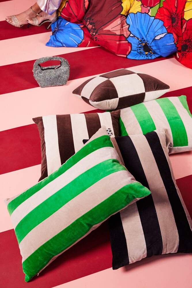 Den mykeste av puter blandet med de kuleste stripene i grønn og beige bomullsfløyel. Med denne puten på sofaen får du umiddelbart en kombinasjon av attitude og luksus. Den sjenerøse størrelsen og fargene passer perfekt til de resterende variantene i Pathi-serien, som kommer i brunt og sort. En fremtidig favoritt som vi ikke vil leve uten. Det er tre fargekombinasjoner.