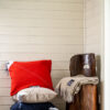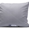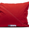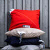 Putetrekk med en diagonal søm , samt en påsydd etikett.