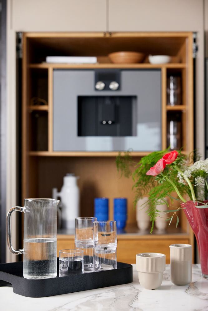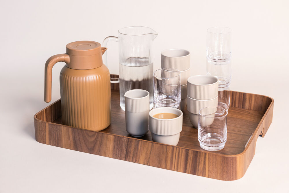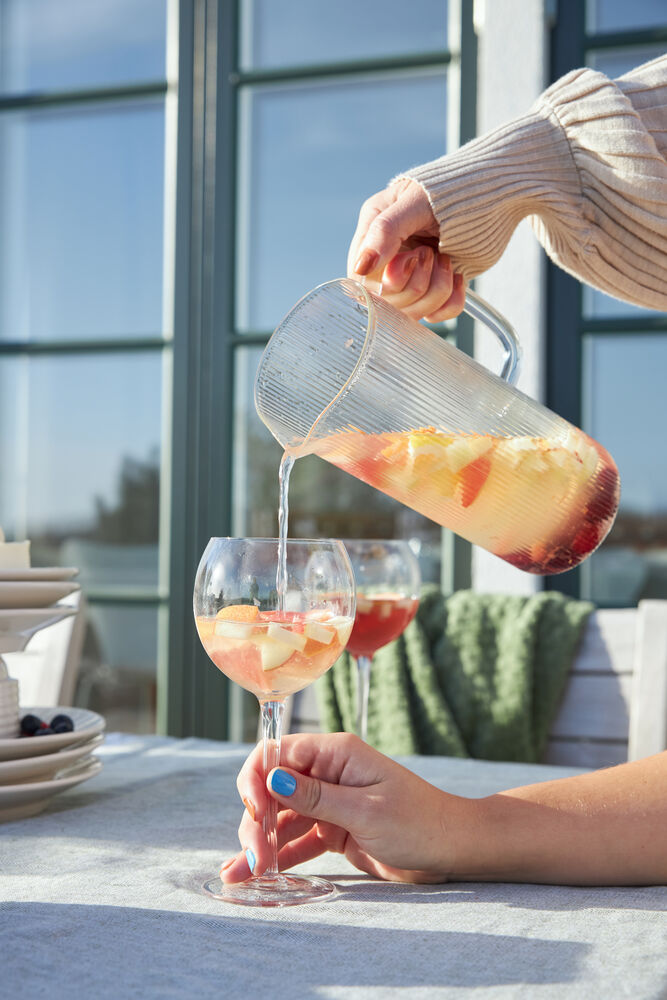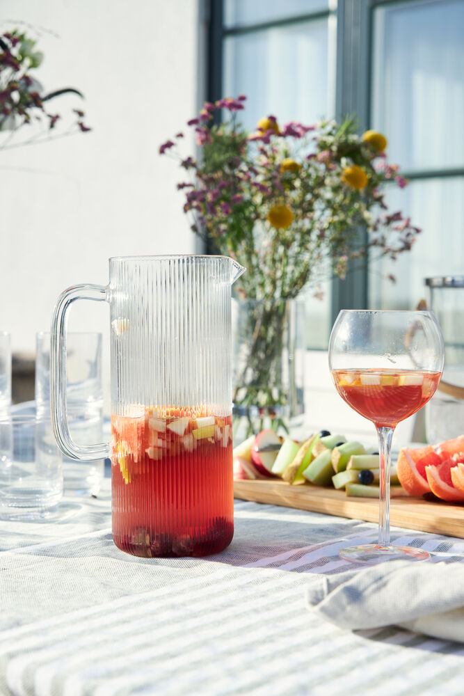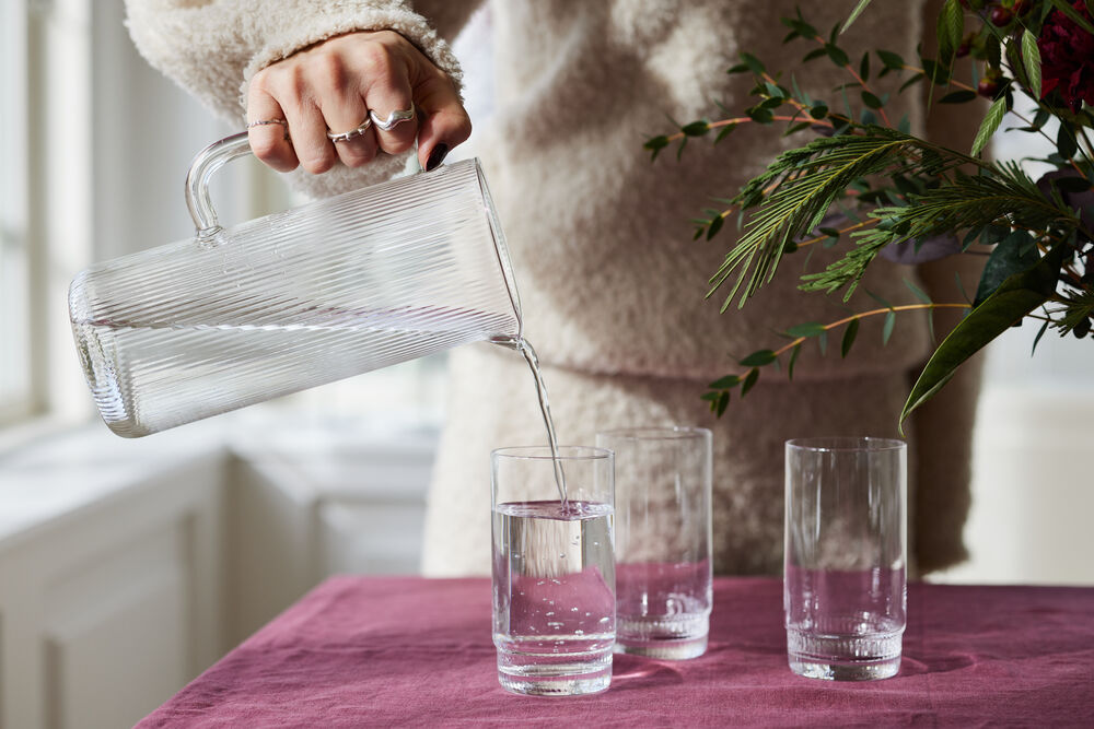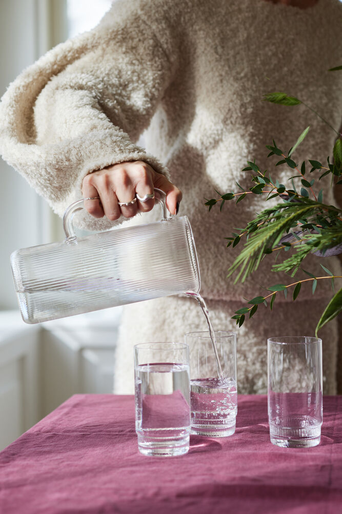 Glassmuggen Saga tilhører den klassiske glasserien Saga fra Sagaform, bestående av vinglass, champagneglass, champagnecoupe, drikkeglass og karafler, som alle har en selvsagt plass i kjøkkenskapet. Med sine karakteristiske striper som følger alle deler av serien på en eller annen måte, skiller den seg ut, men smelter også inn. I denne muggen serverer vi alt fra vann til forfriskende fruktjuicer. Glassmuggen Saga har et bredt håndtak som gjør den behagelig å bære.