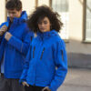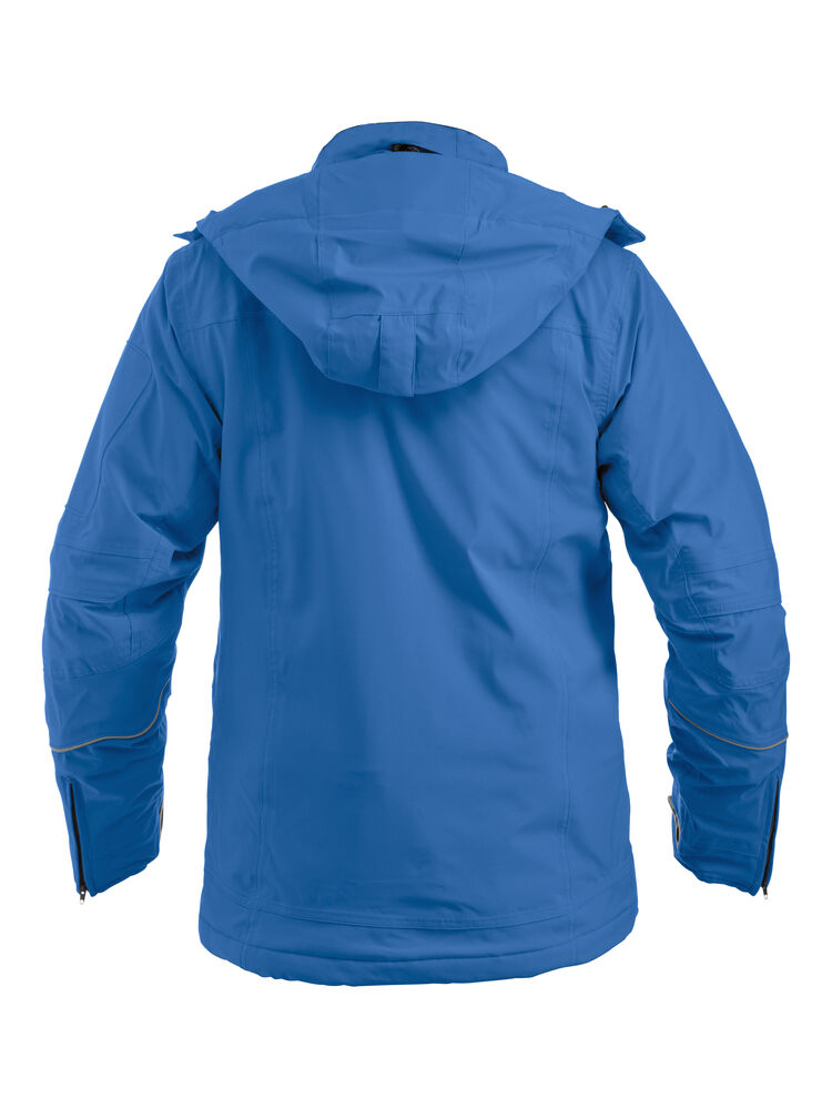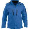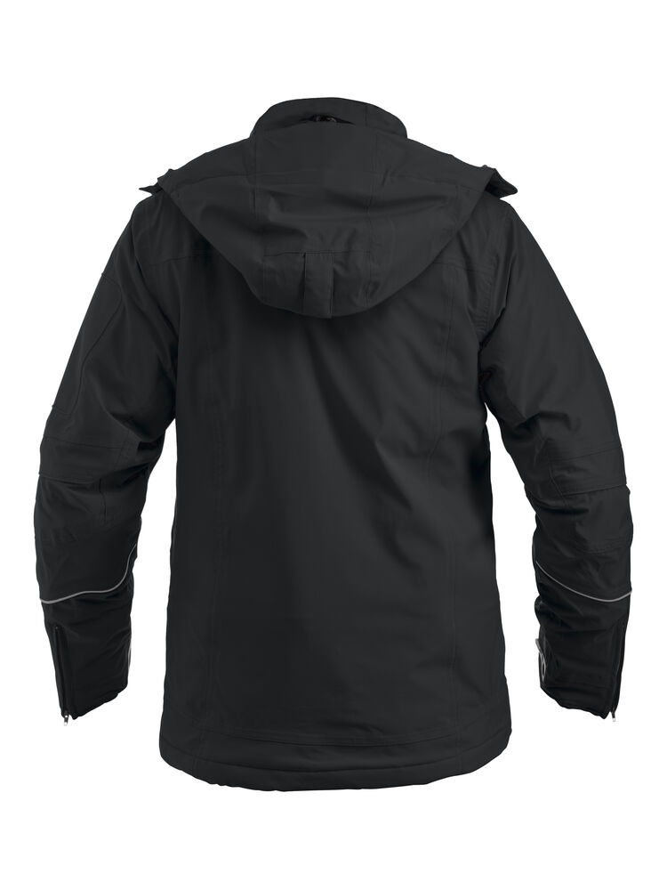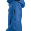 Vattert softshelljakke med avtagbar hette og snølås. Formsydde ermer, skjulte mansjetter. Innvendig lomme med snor og reflekterende piping på ermene. W/P 5000 MVP 5000.