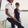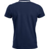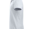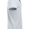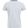 Pique med fargekontrast i knapper, nakkebånd, knappestolpe og splitt i sidene. Stående skjortekrage og knappestolpe med tre knapper på herremodellen og fem på dame. Kontraststripe på krage og armavslutning.