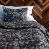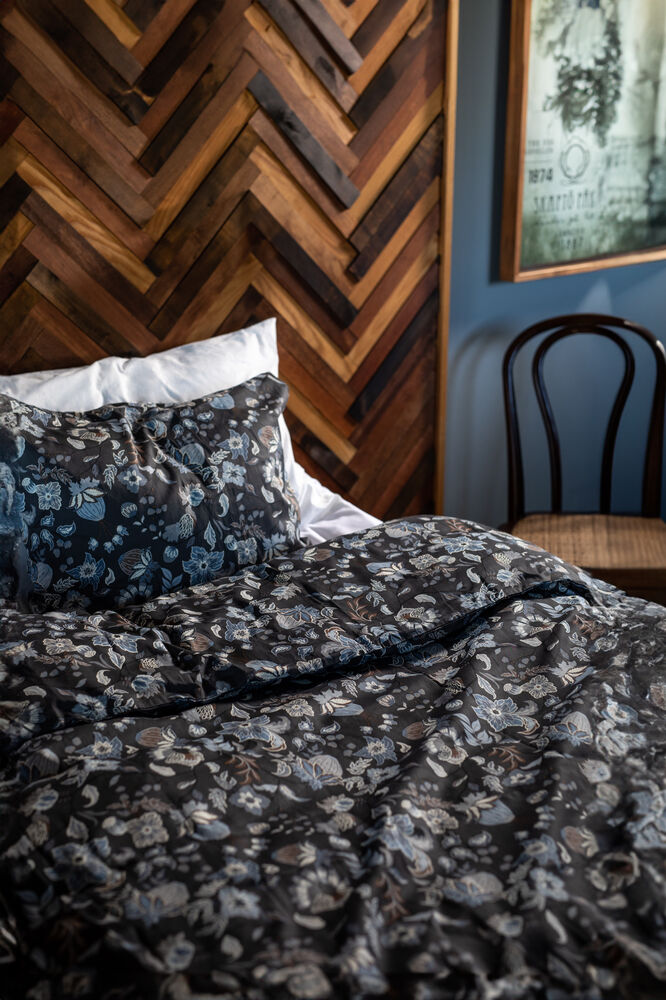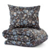 Nydelig sengesett i glatt sateng med blomstermotiv i vakre blå- og gråtoner.