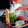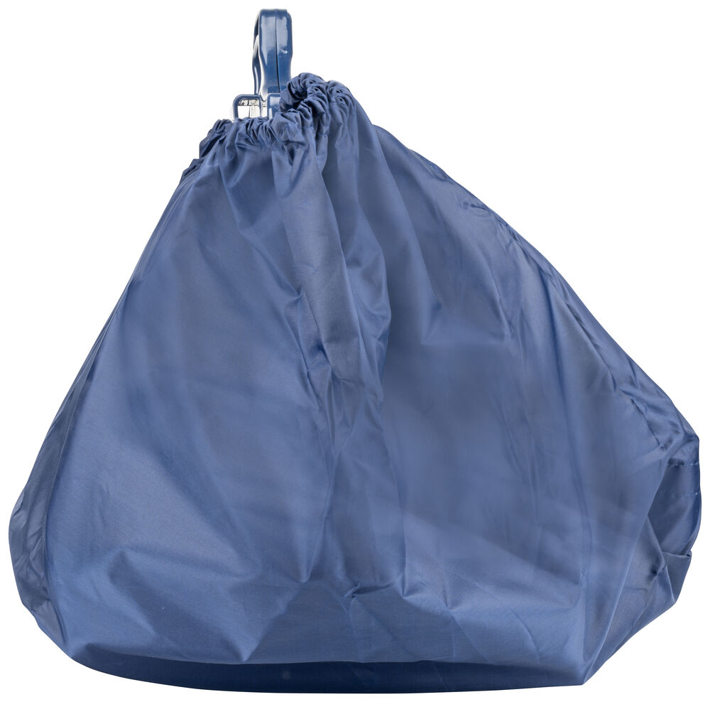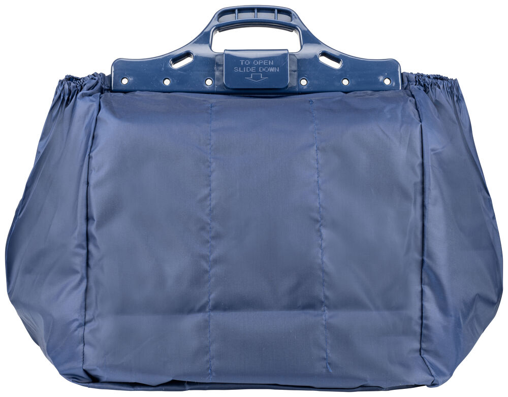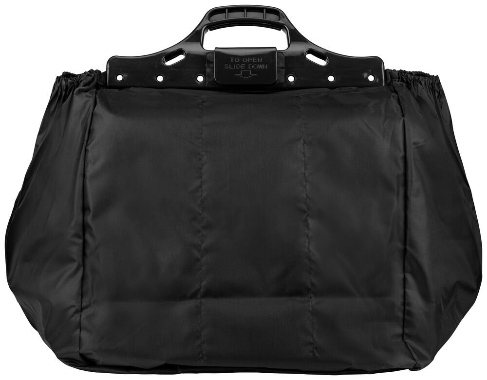 Praktisk shoppingbag som man slår opp i handlevognen så det er lett å putte varene ned. Det følger med en lomme for kjølevarer som man fester med borrelås.