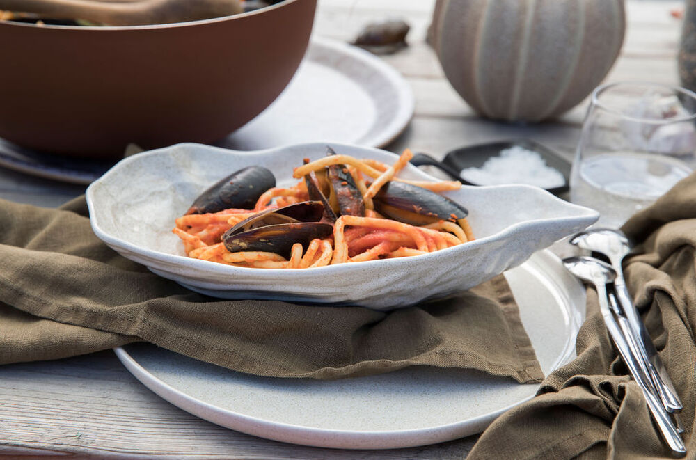En leken skål eller dyp tallerken formet som skallet av en østers. Perfekt til god pasta og passer best med porselenet Raw eller Asparagus fra ByOn.