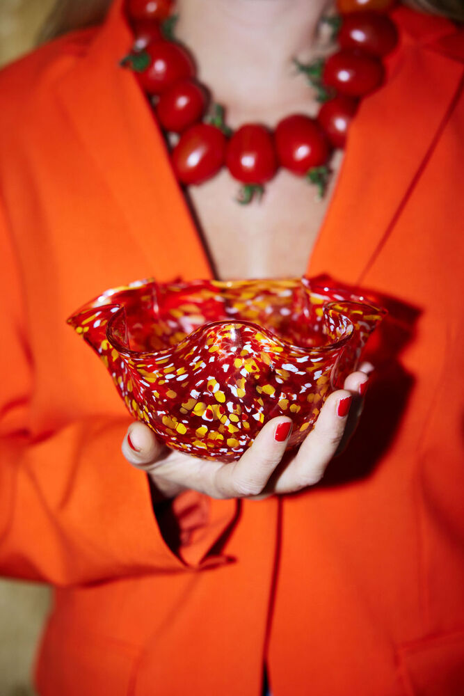 Skålen Cara er en fargeklatt, en brennende karamell med et konfetti-regn av rødt og oransje. Bowl Cara er håndlaget og håndblåst, noe som gjør hvert produkt unikt. Perfekt til snacks, oliven eller med et telys.