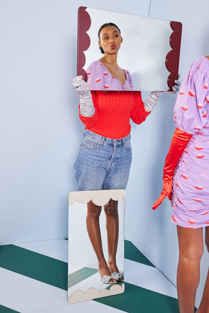 De myke, avrundede formene er tegnet for hånd og skaper lekne halvsirkler som får oss til å tenke på luftige skyer. Rammen har et annet design, hvor den ikke sitter på klassisk vis med fire sider, men kun på to av sidene. Dette gjør den lettere og muliggjør en smidigere kombinasjon med flere objekter. Rammen er spraylakkert mdf og har to ulike oppheng (horisontalt og vertikalt) for å kunne variere måten å plassere den på. Et speil vi absolutt ønsker å se i mange hjem. Tilgjengelig i beige og burgunder. Størrelse 40×70 cm. Design Byon Studio.