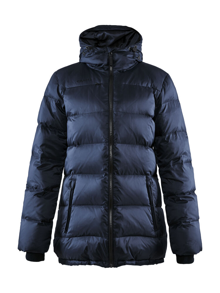 Varm parkas med høy krage, justerbar hette og flere lommer.