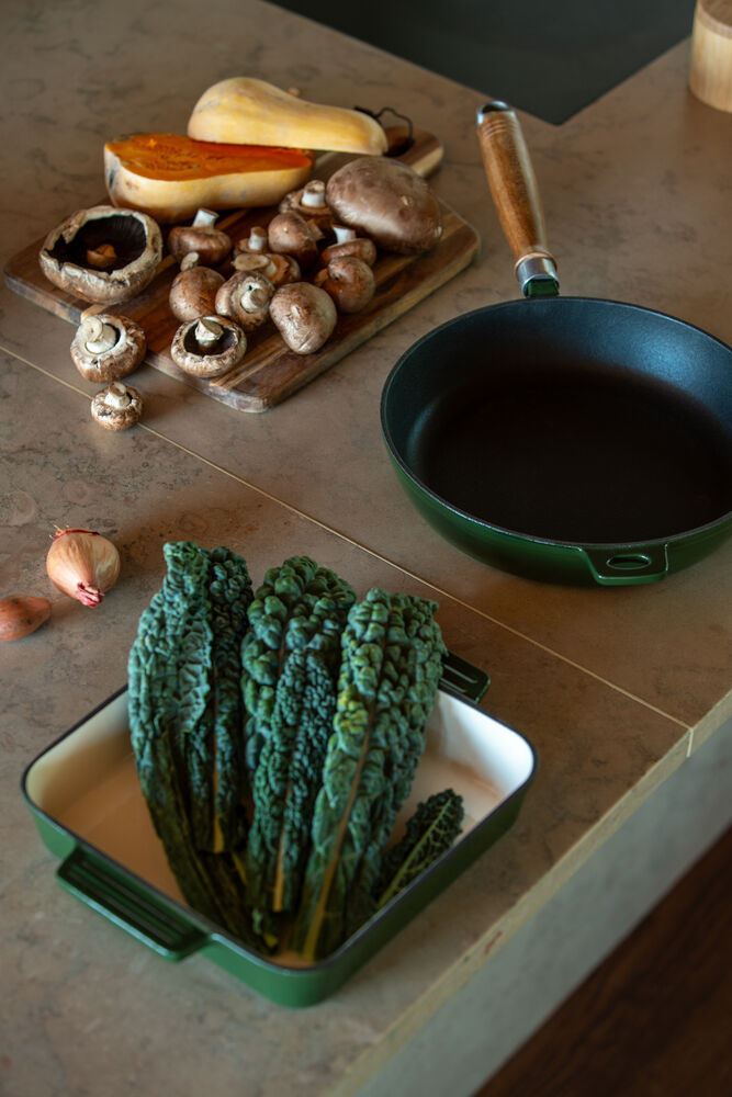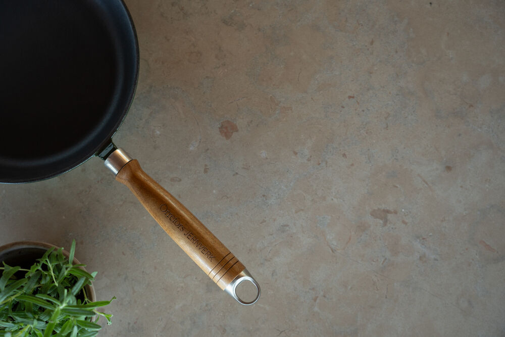 Denne stekepannen er laget av støpejern av svært god kvalitet, og er utstyrt med et akasiehåndtak. Støpejernspannen kan brukes til all slags matlaging, den kan også brukes både på komfyren og i ovnen da håndtaket er avtagbart.