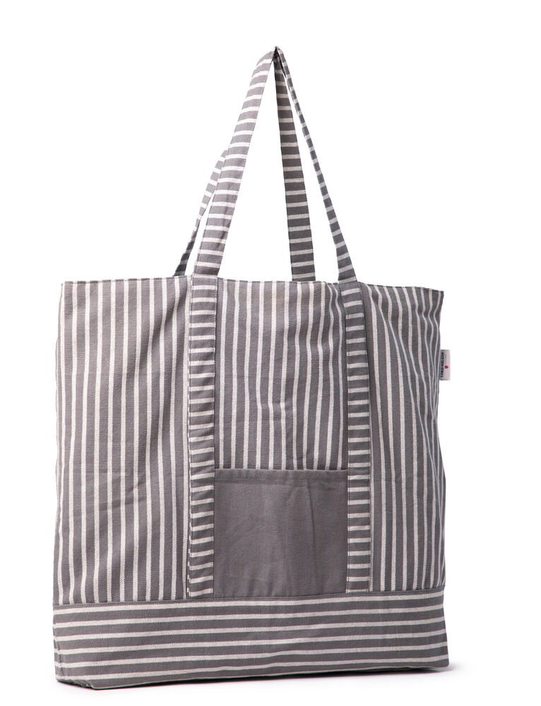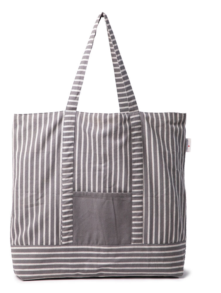 En romslig strandveske i kraftig bomull hvor du får plass til alt du trenger for en dag på stranden. Lommen på siden gir plass til mindre løse gjenstander og solide håndtak håndterer våte håndklær og strandfunn på vei tilbake.