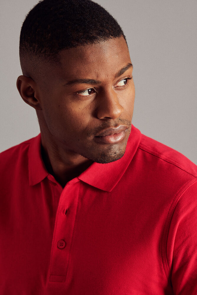 Surf pique med smalere passform. Flatstrikket krage, tre knapper i stolpe.