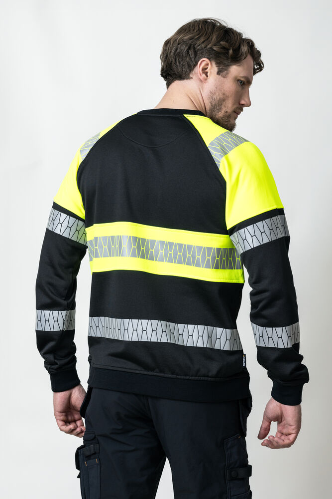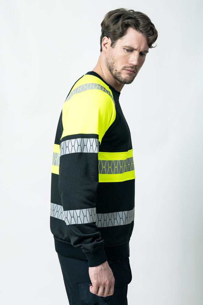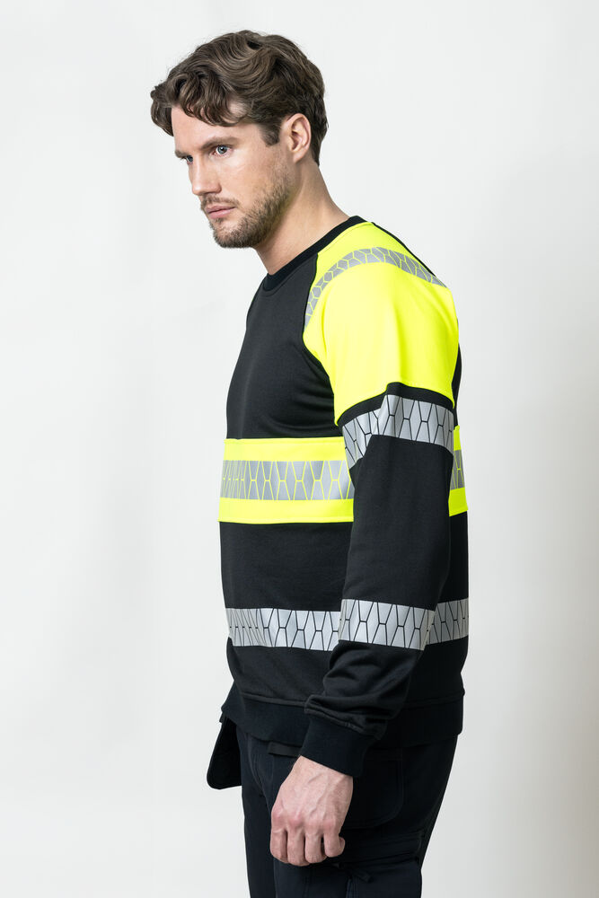 Genser i komfortabelt materiale, med froté på innsiden. Ribbestrikket hals, nederkant og mansjetter. Påvarmet reflekstransfer, Jobman-design. Reflekser over skuldrene som gir økt synlighet. Sertifisert i synlighetsklasse 1 i henhold til EN ISO 20471