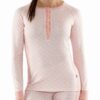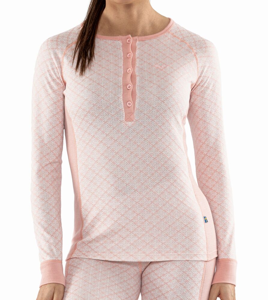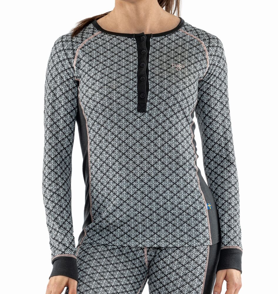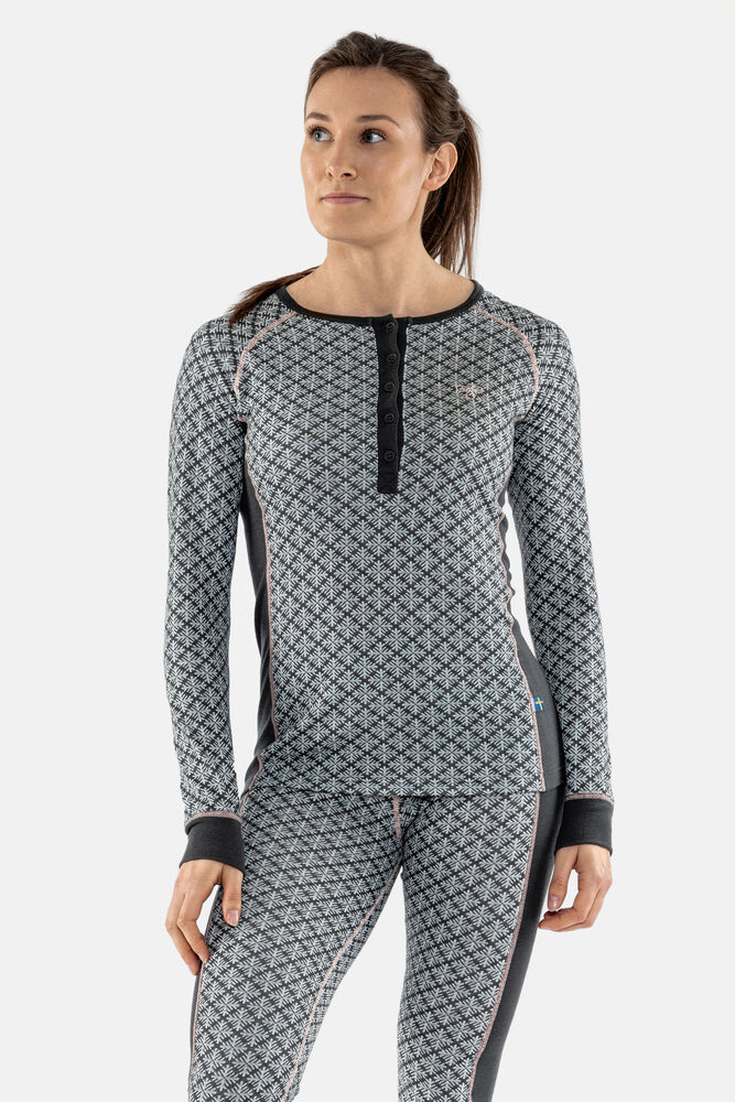 Undertrøye for dame med rund hals og knapper på brystet. God på fukttransport og er naturlig antibakteriell. Perfekt for deg som bryr deg om miljøet og ønsker å ta bærekraftige valg. Passer utmerket til fysisk aktivitet utendørs, alt fra langrenn med høy intensitet til gåturer.