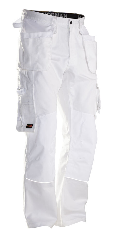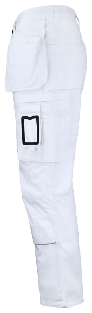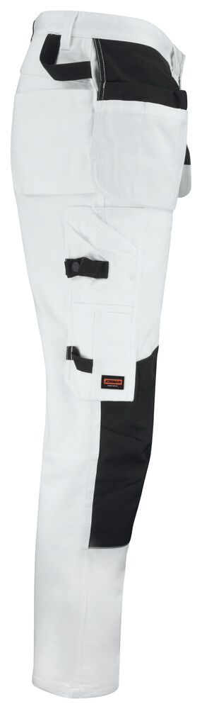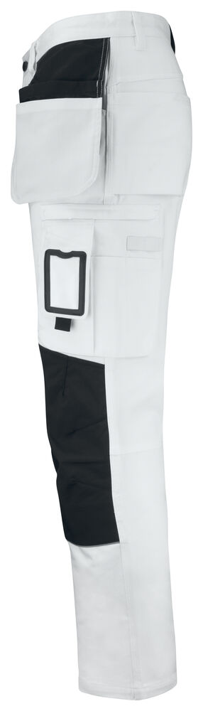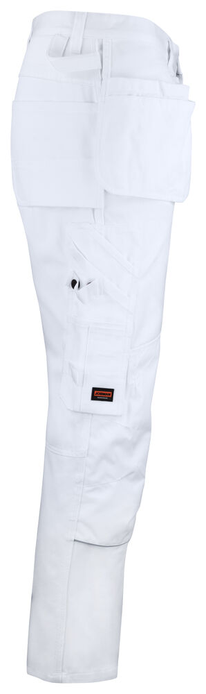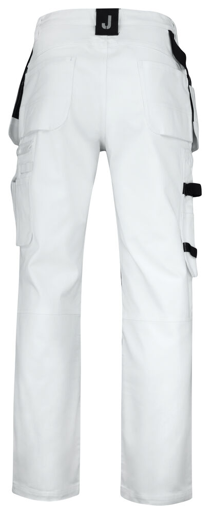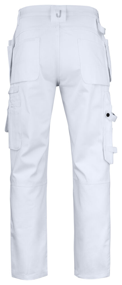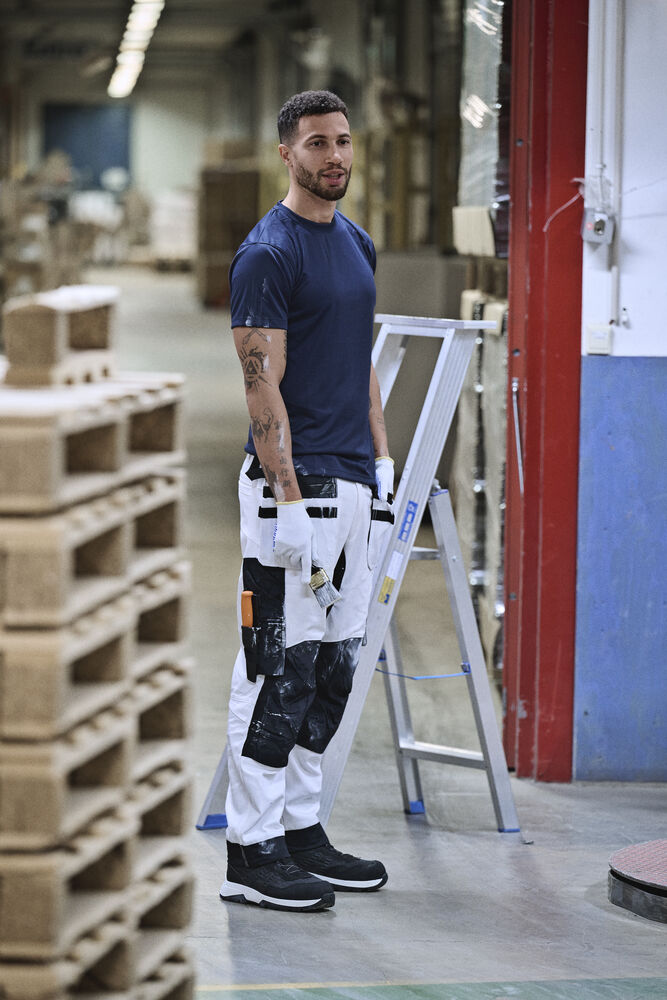 Malerbukse med svært god passform og design utviklet for profesjonelle malere. Jobmans bomullstwill har gode egenskaper, den er slitesterk, absorberer maling og minimerer gjennomblødning. Malerbuksen har romslige hengelommer. Den indre lommen har vannavstøtende FA™-polyamidfôr på innsiden. Romslige front- og baklommer, benlomme med ekstra rom og glidelås, mobiltelefonlomme og ID-kortholder. Kniv- og tommestokklomme med praktiske rom for alle tenkelige maleverktøy. Buksen har en løkke for kluter. Tåler vask på 85 grader. Knelommer i slitesterkt FA™-polyamid med 2 posisjoner for knebeskyttelse.