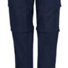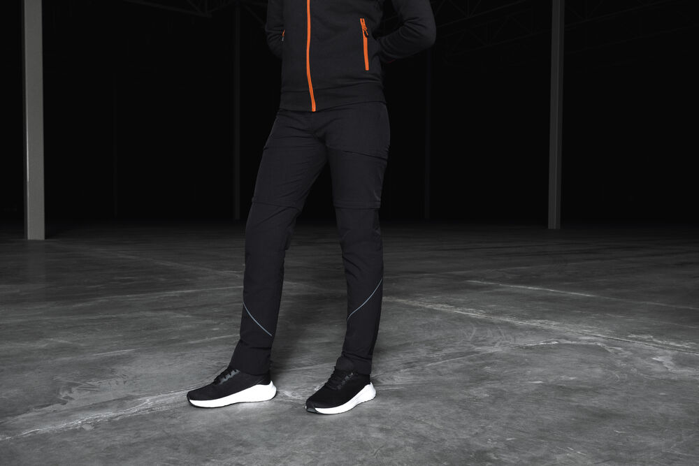Arbeiderbukse med et sporty, moderne utseende. Buksen har glidelås rundt lårene, slik at den kan gjøres om til shorts. Buksen er svært komfortabel på grunn av stretchkvaliteten og den elastiske linningen. To jeanslommer i front. Venstre frontlomme har en separat plass for telefonen. To lårlommer med glidelås, og en baklomme. Hengeløkke i linningen. Dobbel kant som gjør det mulig å forlenge buksene med 5 cm. I den indre venstre sidesømmen er det anordnet en lomme for å sy i en vaskebrikke. Leveres i en biobasert, komposterbar pose.