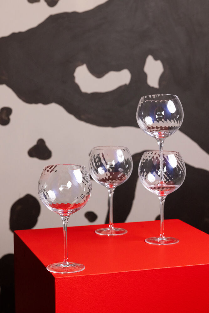 Opacity vinglass i 4-pakk er den perfekte gaven. Vinglasset er designet for en perfekt opplevelse – på bordet, i hånden og når du drikker. Det er et tynt vinglass med en perfekt kontrast mellom luksus og selvsikkerhet. Glasset har et vakkert stripete mønster i klart glass. Design Byon Studio. Leveres i 4-pakning i Byon-boks.