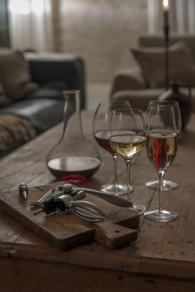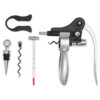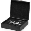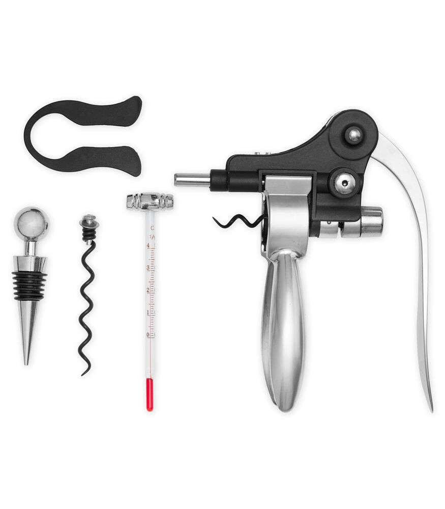 Eksklusivt vinsett i stilrent, rustfritt stål. Vinåpneren med smart og presis rotasjonsteknologi fjerner enkelt både naturlige og syntetiske korker. Settet inneholder også termometer, folieskærer og en dekorativ stopper som beskytter vinen hvis du ønsker å oppbevare den.
