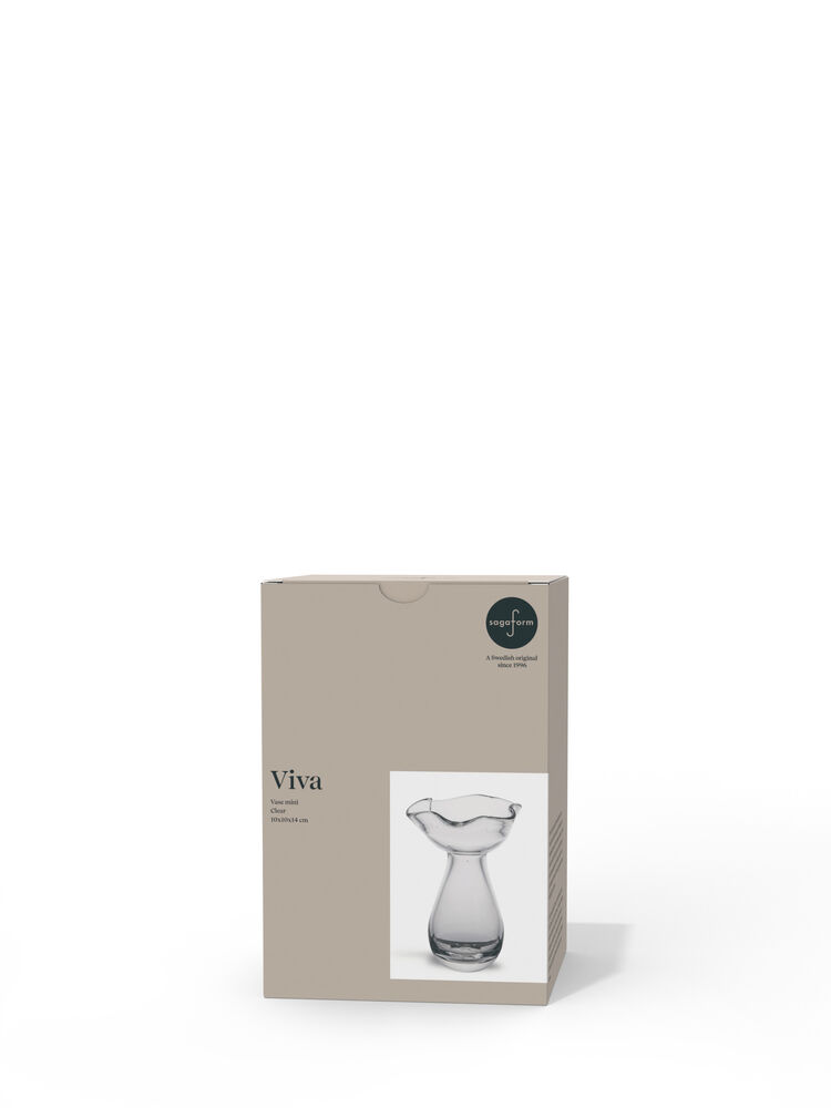 Inspirert av naturens egne kraftkilder, er Viva vase mini en vakker original. Toppen av vasen leder tankene til en nyåpnet blomst, mens formen på basen er hentet fra en regndråpe. Hyasintløkene ligger perfekt i den avrundede toppen, men små blomster eller stiklinger står også stødig. Vi gir gjerne triste buketter et nytt liv og knipser av toppene for å dekorere Viva vase mini. Vasen er vakker når den står alene, men er også fin å blande med resten av samlingen av Viva vaser. Tilgjengelig i to farger – klar og rav.